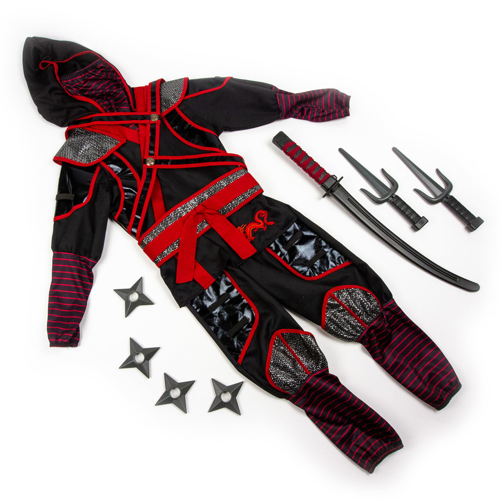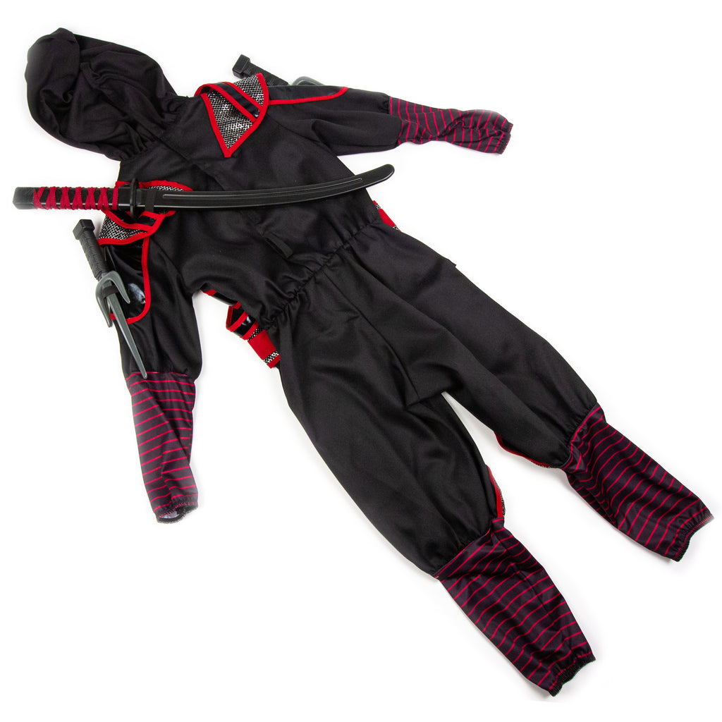 The hooded jumpsuit comes complete with a striped face mask, attached leggings, and plenty of gear — including two daggers, four throwing stars, and a dramatic toy ninja sword. Perfect for kids who love action and honorable traditions.